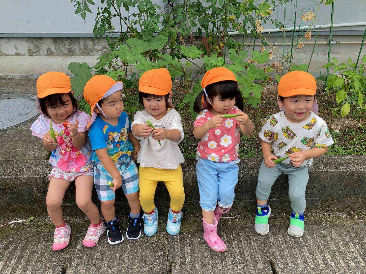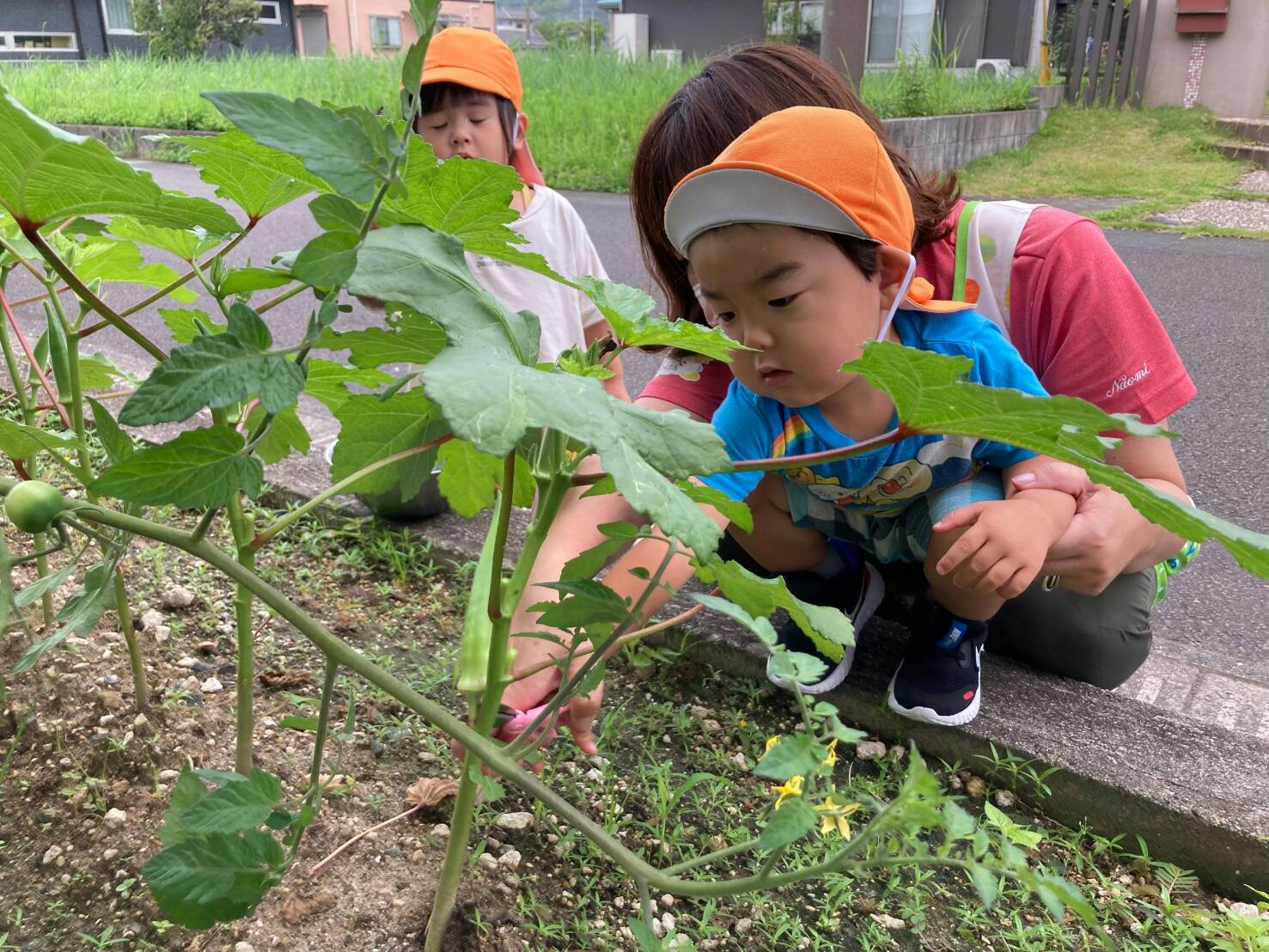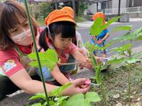 のびのびっこファームの夏野菜さんたちが立派に育って収穫時期になったので、2歳児さんで収穫をしました♪