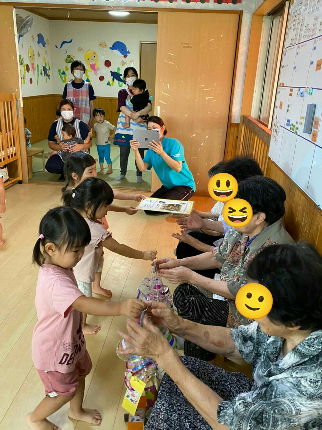 久しぶりのおばあちゃん達との再会にみんな笑顔がいっぱいでした♪1曲だけお遊戯のプレゼントも見せることが出来ました♪
