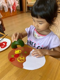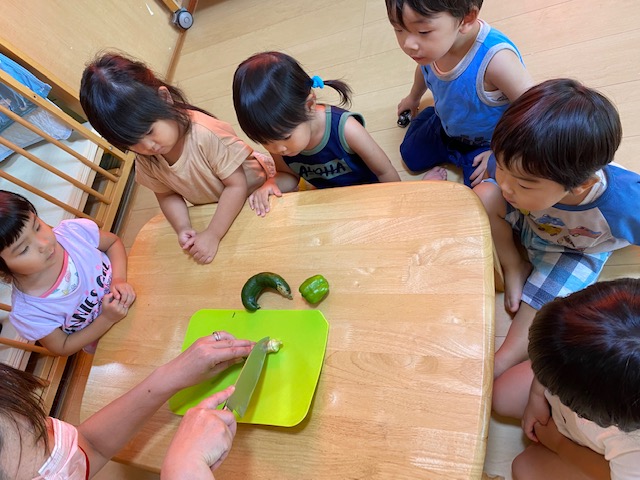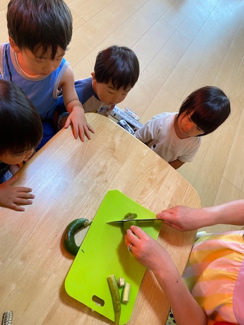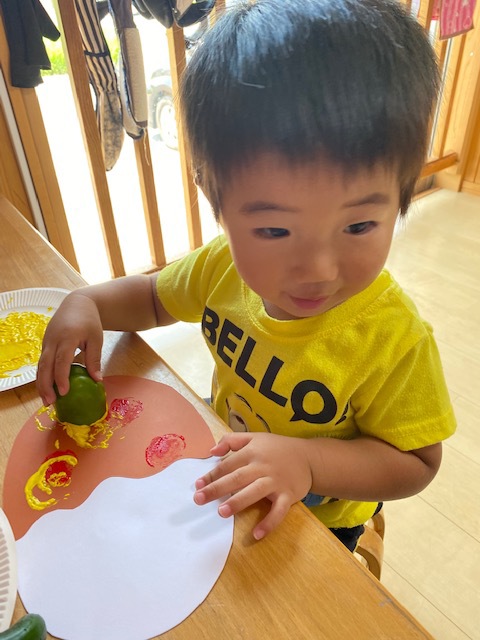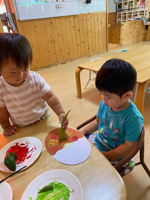 のびのびっこの畑で収穫した夏野菜を使って、野菜スタンプでカレーを作りました!