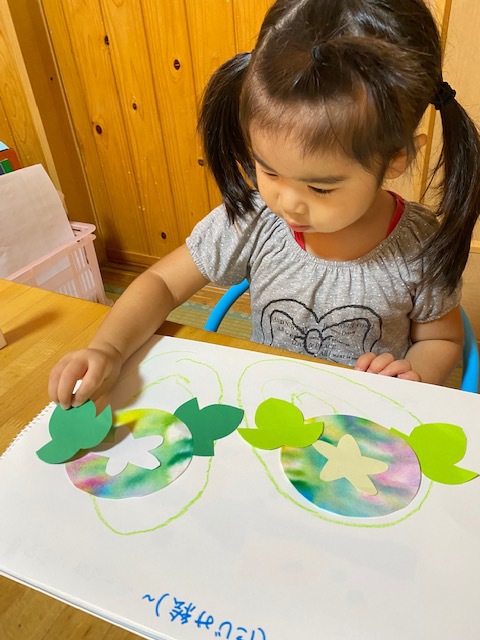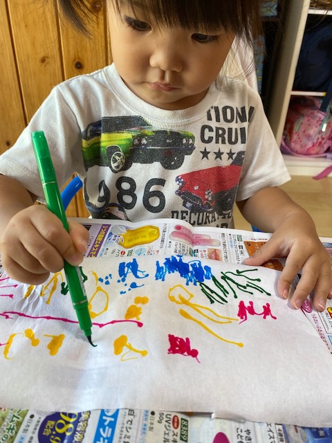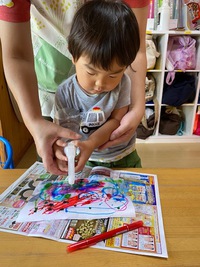 障子紙に水性ペンで模様を描いて、霧吹きで水をかけて、染紙で朝顔製作!