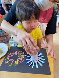 8月の製作で夜空に上がる花火のように、黒い画用紙に大きく綺麗な花火を打ち上げました!(^^)!